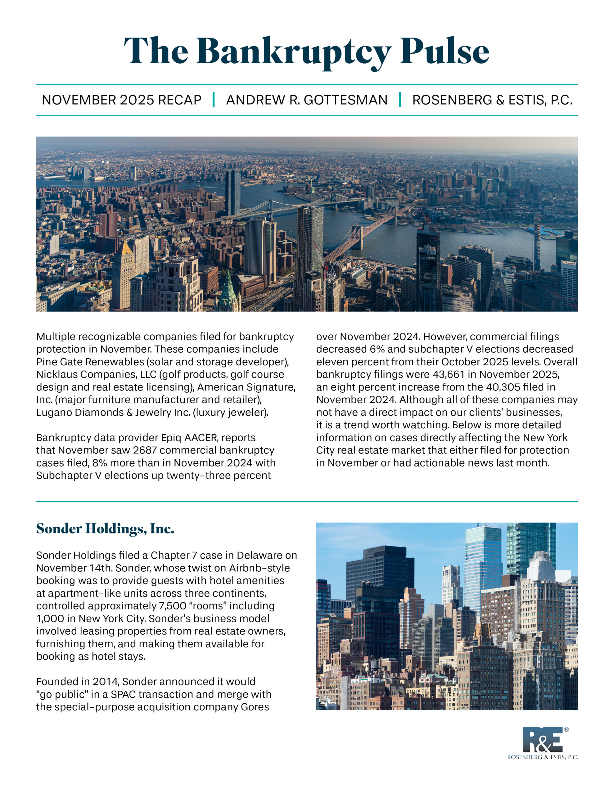 We are pleased to release the second edition of The Bankruptcy Pulse—your trusted source for a concise recap of last month’s key bankruptcy developments. As New York’s premier real estate law firm, R&E regularly represents property owners, landlords, lenders, and other stakeholders in both major and middle-market bankruptcies spanning a wide range of industries. Leveraging our cross-disciplinary Distressed Debt Team, we assess risk, safeguard client interests, and develop strategies to address recovery and liquidity challenges.
