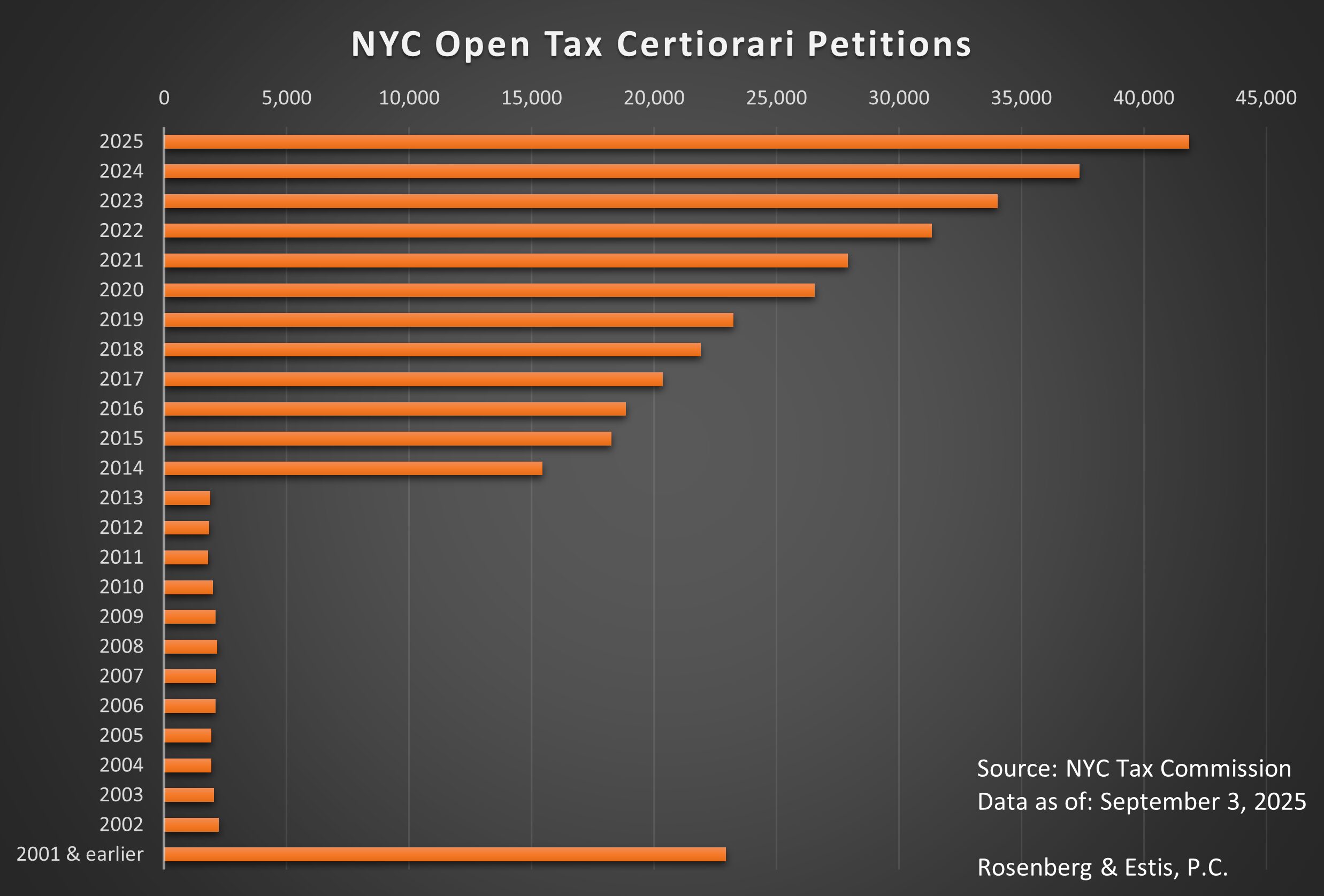 I also recently wrote about pending real property tax certiorari cases in New York City. These are cases that not only have filed petitions, but are actively pursuing them in court. I wrote that the number of pending cases reached a record high of 2,088 (as of August 17, 2025). See my blog: Real Property Tax Certiorari Caseload Trends in NYC