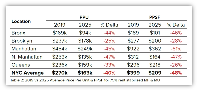 The sales market is already sending that signal. Ariel Property Advisors’ 2025 Multifamily Year in Review shows that buildings with 75% or more rent-stabilized units have suffered a major decline in value since 2019. Citywide, average price per unit fell from $270,000 in 2019 to $163,000 in 2025, a 40% decline. Average price per square foot fell from $399 to $209, a 48% decline. The decline was not isolated to one borough: Manhattan price per square foot fell 61%, Northern Manhattan price per unit fell 47%, and Bronx price per unit fell 44%.