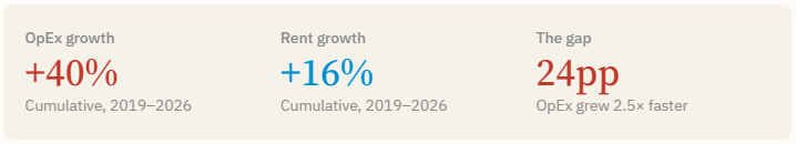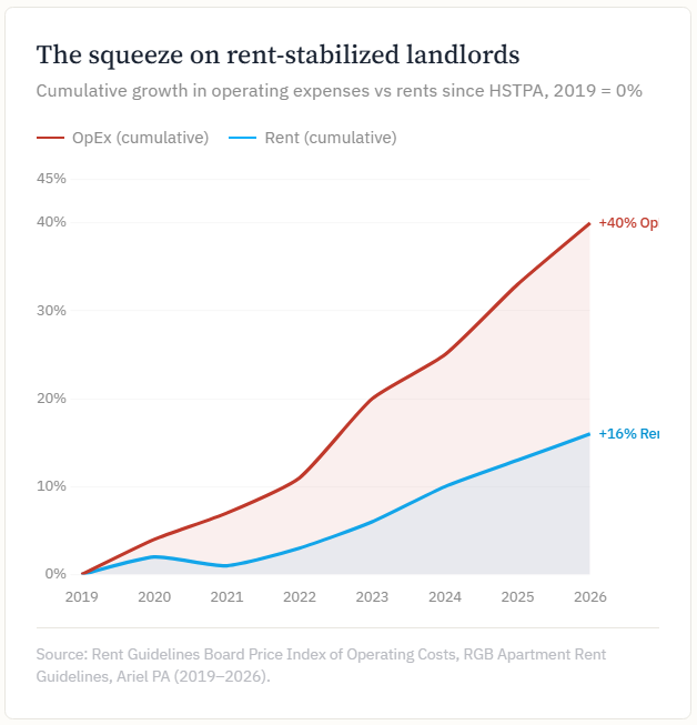 The most important valuation pressure is net operating income. In Q1 2026, Ariel reported that cumulative operating expenses had grown 40% since 2019, while rent growth had increased only 16%, creating a 24-percentage-point gap. That is the assessment issue in its simplest form: if regulated income cannot keep pace with expenses, NOI compresses. If NOI compresses, market value should decline.